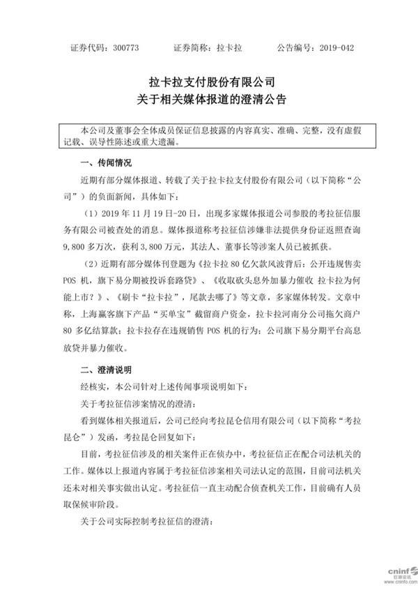 11月20日当晚,深交所向拉卡拉下发关注函,要求说明公司对考拉征信违规事项的知情情况、公司是否控制考拉征信、考拉征信经营违规事项对公司的影响、公司与考拉征信是否存在业务往来等情况。11月21日,拉卡拉发布了一篇5页的公告:《拉卡拉支付股份有限公司关于相关媒体报道的澄清公告》。