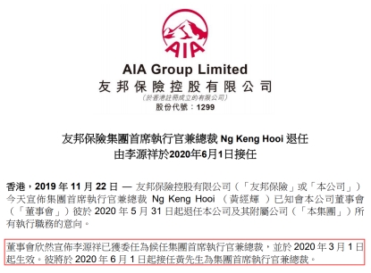 友邦现任首席执行官及总裁黄经辉将于2020年5月31日退任,李源源将于2020年6月1日接任其为新任CEO。