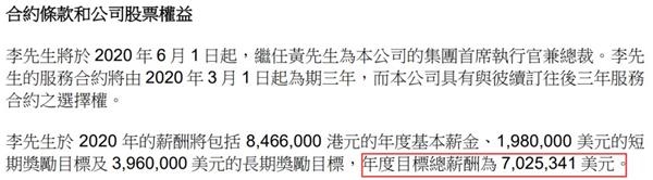 最值得瞩目的是,友邦公告了李源祥的薪酬情况及为其支付的转会费。李源祥的服务合约将由2020年3月1日起为期三年,友邦具有与其续订往后三年服务合约之选择权。2020年薪酬将包括846.6万港元的年度基本薪金、198万美元的短期奖励目标及396万美元的长期奖励目标,年度目标总薪酬为702.53万美元,以实时汇率估算约折合人民币4946.19万元。