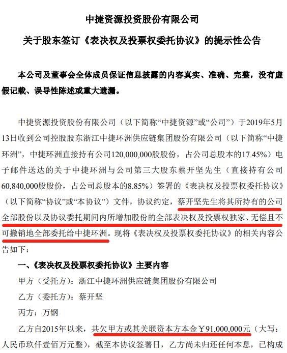 今年5月14日,*ST中捷发布公告称,第三大股东蔡开坚把持有的全部*ST中捷股份及协议委托期间内所增加的股份全部表决权及投票权独家且不可撤销委托给了控股股东中捷环洲,原因是蔡开坚欠了中捷环洲和关联方9100万元。