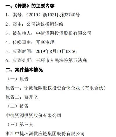 事情可没消停,又过了一个月,*ST中捷7月16日的一份公告中显示,宁波沅熙联合蔡开坚又把*ST中捷告上法庭,要求撤销2019年5月17日被告*ST中捷于2018年度股东大会上通过的全部决议,这其中就包括上述提及的《委托协议》。
