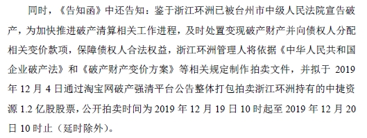 最为严重的是,公司控股股东已经破产了。12月3日晚,*ST中捷公告称,公司控股股东中捷环洲已被法院裁定破产,并拟于2019年12月4日通过淘宝网破产强清平台公告整体打包拍卖浙江环洲持有的中捷资源1.2亿股股票,公开拍卖时间为2019年12月19日10时起至2019年12月20日10时止(延时除外)。
