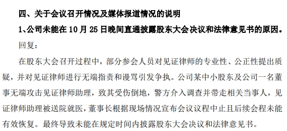 内斗已很热闹,而股东大会上发生的打人事件,则更加体现了*ST中捷的混乱。根据公告,在10月25日召开的第三次(临时)股东大会上,中小股东薛青锋、董事倪建军无端攻击见证律师助理致其受伤,甚至要让警察来才能稳住局面。
