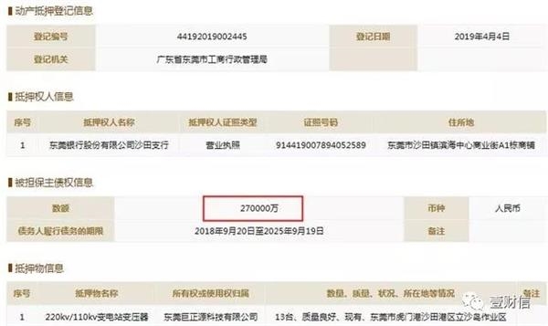 但是据企信网,东莞银行的一则抵押权人信息显示,巨正源2018年以设备为抵押物,向东莞银行沙田支行作担保,债权数额为27亿元,履行债务的期限是2018年9月20日至2025年9月19日,该笔动产抵押的登记日期为2019年4月4日。至于该笔债权数额真相如何,是否为东莞银行向其放贷的金额,我们不得而知,如属实的话,这与招股书中披露的向巨正源发放贷款和垫款余额存在巨大出入,相关部门或应给予重点关注。