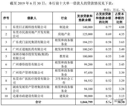 但是《壹财信》却发现,截至2019年6月30日,东莞银行招股书中前十大单一借款人中仅有一家企业为制造业,租赁和商务服务业客户多达4家,而其中还有借款人与东莞银行的关系密切。
