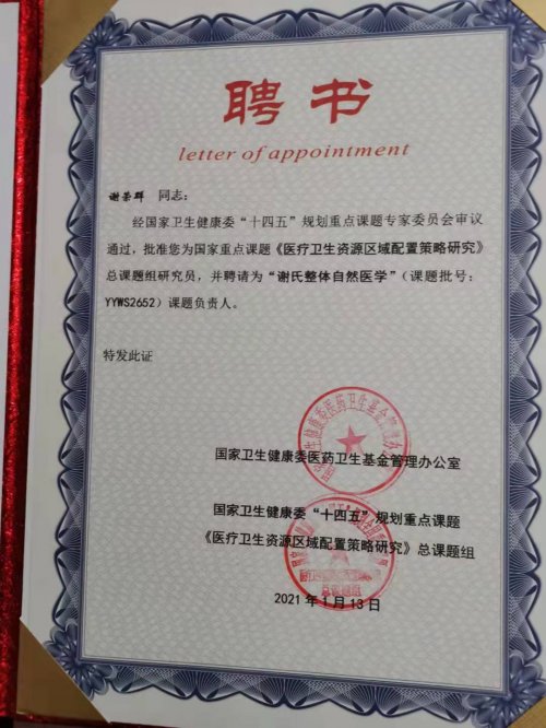 在现代医学应对疾病挑战进入一个个平台期的时候,谢荣群院长用攻坚克难和自我革新的精神,紧跟时代步伐,攀登医学高峰,打破历史以来的“单病、单医、单治”的治疗方法,讲究天人合一”,“辨证论治”。不分内、外、儿、妇、五官、骨伤诸科,将人一体多种病症完全可以同步进行治疗,自成科学理论体系,独创了谢氏整体医学疗法。对多年久治不愈的“疑难杂症”、“综合症”有独特的治疗方法。